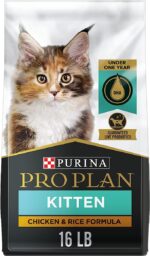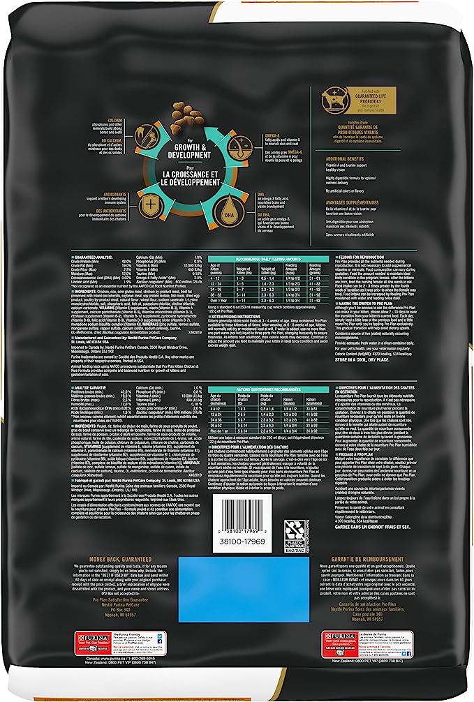 Help your growing kitten thrive when you serve her Purina Pro Plan DEVELOPMENT Chicken and Rice Formula dry kitten food. This high-protein kitten food features high-quality protein, including real chicken as the first ingredient, and every high-quality ingredient is carefully chosen for a specific purpose. Every serving in this kitten dry food delivers DHA, an omega-3 fatty acid, to nourish her brain and vision development and omega-6 fatty acids and vitamin A to nourish skin and coat. Plus, it’s fortified with guaranteed live probiotics to support digestive and immune health. Formulated for kittens through the first year of life, this super-premium kitten food provides 100 percent complete and balanced nutrition to support her overall health and wellness. Purina Pro Plan DEVELOPMENT dry kitten food formulas are highly digestible to support optimal nutrient absorption and are proudly manufactured at Purina-owned, U.S. facilities.